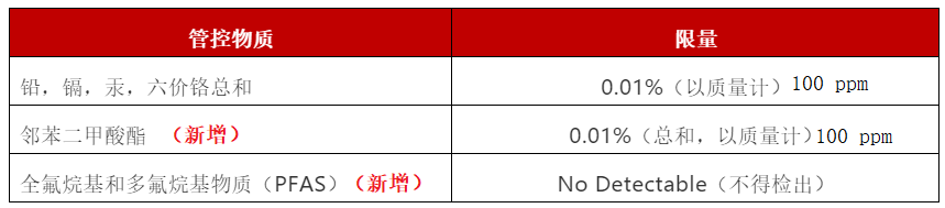 1、修訂後的(de)管控物(wù)質和(hé)限量要(yào)求如(rú)下(xià):