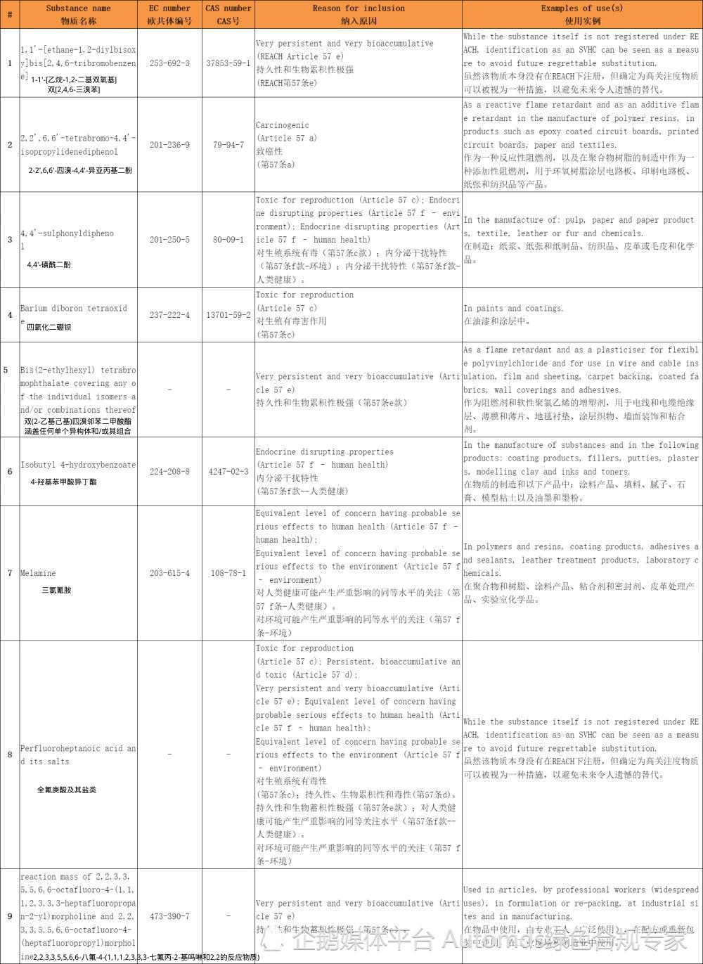 此次新增的(de)9項高(gāo)關注物(wù)質(SVHC)如(rú)下(x∞≈ià)