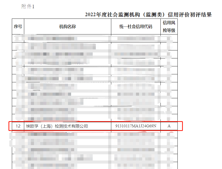埃歐孚在2022年(nián)度生(shēng)态環境↓₩™監測社會(huì)化(huà)服務機(jī)構(監測類<≤)信用(yòng)評價中取得(de) “A”級