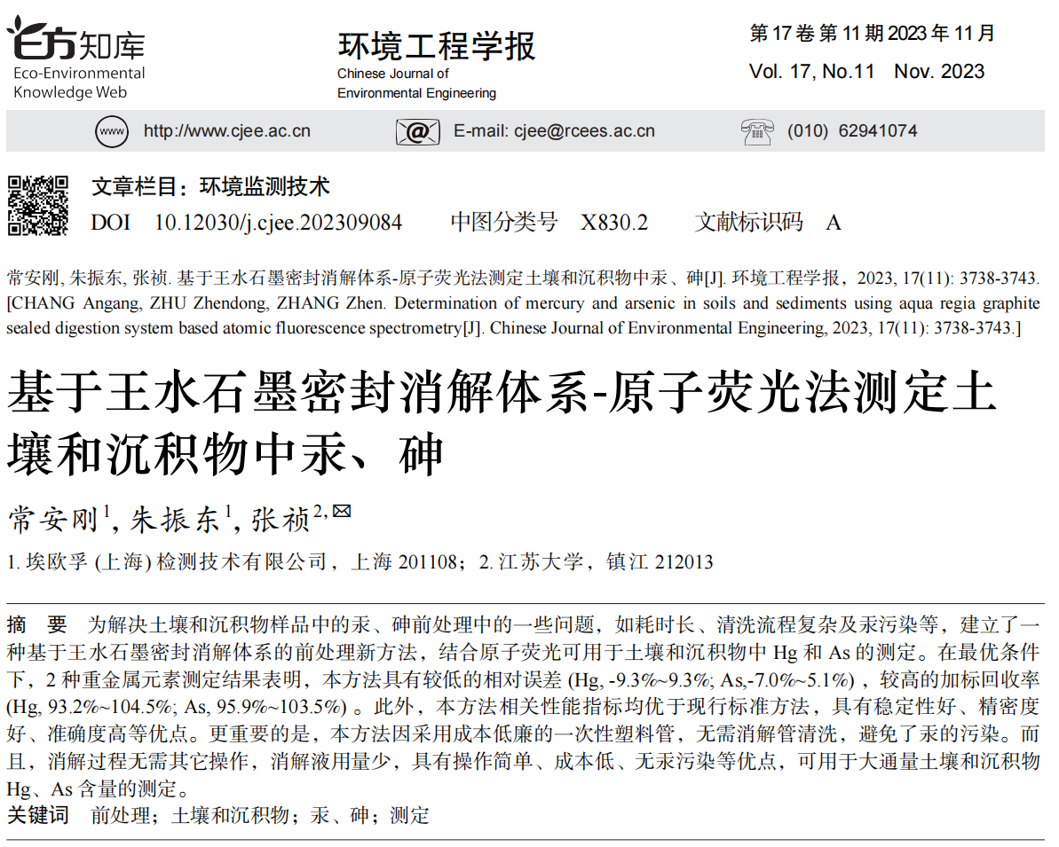 熱( δδrè)烈祝賀我司常安剛團隊發表的(de)論文(wén)《基于王水(™♠εshuǐ)石墨密封消解體(tǐ)系-原子(zǐ)熒光(guāng♦"↕)法測定土(tǔ)壤和(hé)沉積物(wù←₽<♠)中汞、砷》被《環境工(gōng)程學報(bà ≤o)》期刊發表。